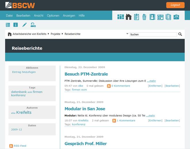 Blogs (Abkürzung für „Web log“) sind ursprünglich eine Art von Web-Tagebüchern, d.h. eine Person veröffentlicht ihre täglichen Eintragungen, die jedermann im Web lesen kann. Ein Blog in BSCW besteht aus einer Folge von Einträgen, die normalerweise Texte von kurzer bis mittlerer Länge sind und als HTML-Dokumente auch Bilder und Verweise auf anderes Material im Web enthalten können. Blog-Einträge haben einen Betreff und können auch mit Tags versehen werden, d.h. mit frei vergebenen Schlagworten. Die Einträge eines Blogs werden in umgekehrter chronologischer Reihenfolge angezeigt, d.h. der letzte Eintrag wird als erster angezeigt.