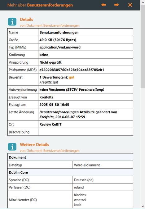 o Dokument unter Versionskontrolle: Für ein Dokument unter Versionskontrolle zeigt die Info-Seite zusätzlich noch die Versionshistorie als Tabelle an. Klicken Sie die Versionsnummer in der linken Spalte an, um die gewünschte Version auf Ihr lokales System herunterzuladen.