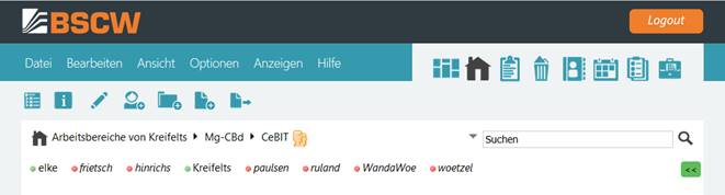 Die Kontaktstatusanzeige gibt Auskunft über die „Anwesenheit in BSCW“ von Mitgliedern eines gemeinsamen Arbeitsbereichs, d.h. über ihre aktuelle Aktivität in BSCW. Die Kontaktstatusanzeige wird unter der Navigationsleiste des gemeinsamen Arbeitsbereichs angezeigt und wird mit oder im oberen Menü aktiviert. Im ersteren Fall werden alle Mitglieder mit ihrem Kontaktstatus angezeigt, im letzteren Fall nur diejenigen Mitglieder, die aktuell in BSCW aktiv sind oder in jüngster Vergangenheit aktiv waren.